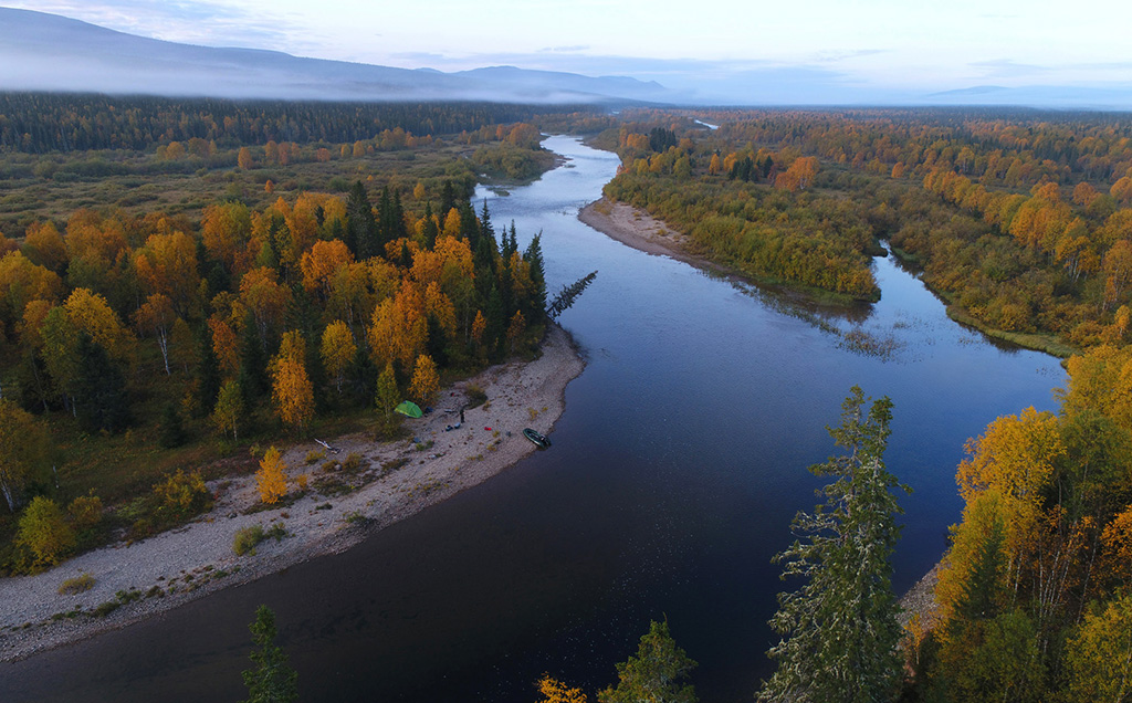 My boat and tent in the upper reaches of the Shchugor River. September 2019
